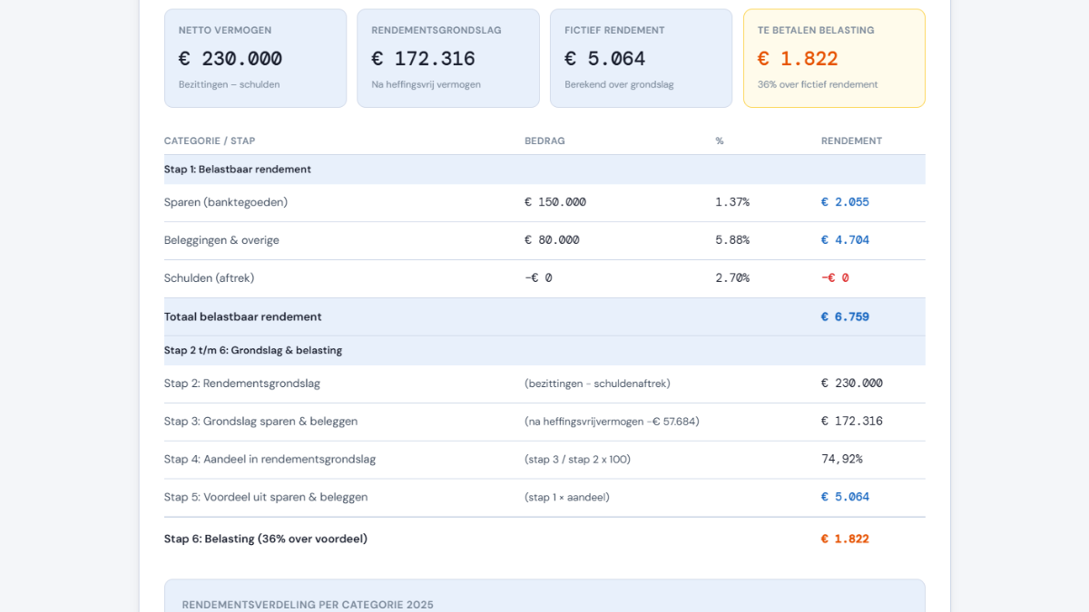 Het fictieve rendement verschilt per vermogenscategorie. Voor 2025 gelden de volgende definitief vastgestelde percentages: