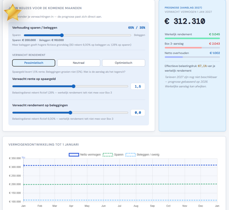 Voer je vermogenspositie in en zie direct de prognose. Gratis calculator voor de huidige stand, of Lopend Jaar in premium voor scenario's en tussentijds bijhouden.